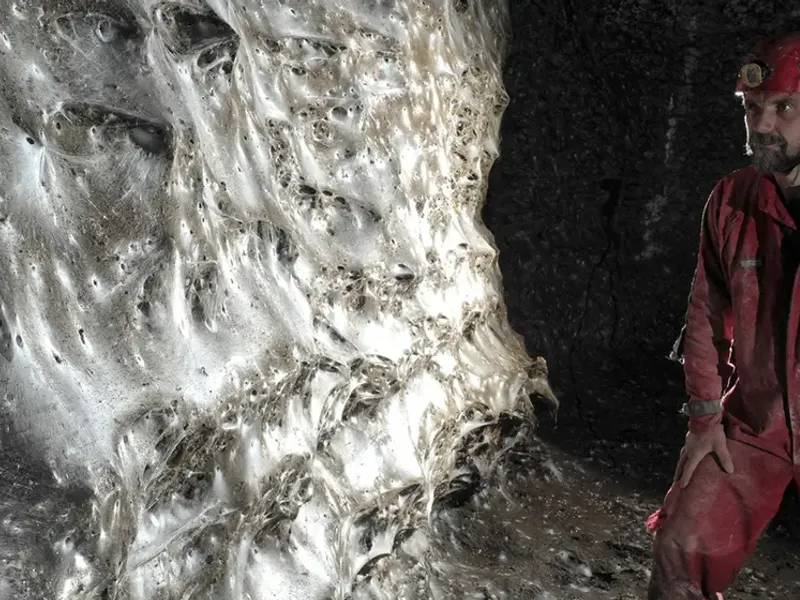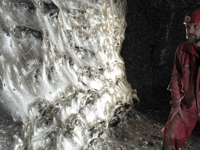Enorma pânză se întinde de-a lungul pereților stâncoși ai unui pasaj din așa-numita Peșteră de Sulf și este alcătuită din nenumărate substructuri în formă de pâlnie.