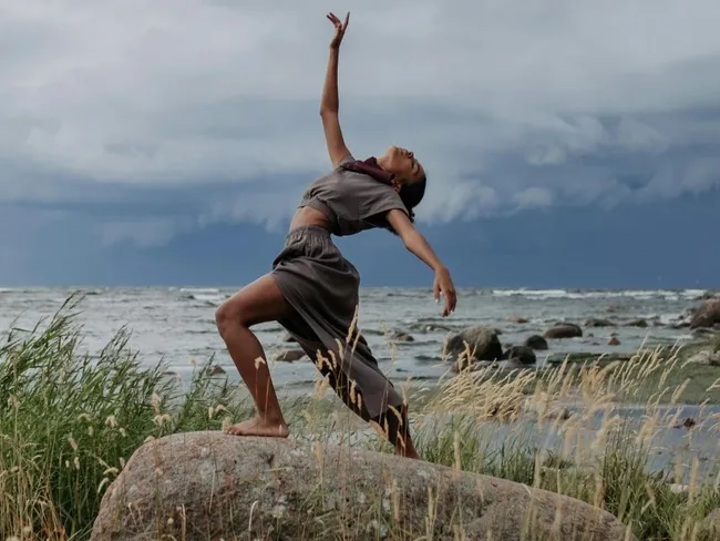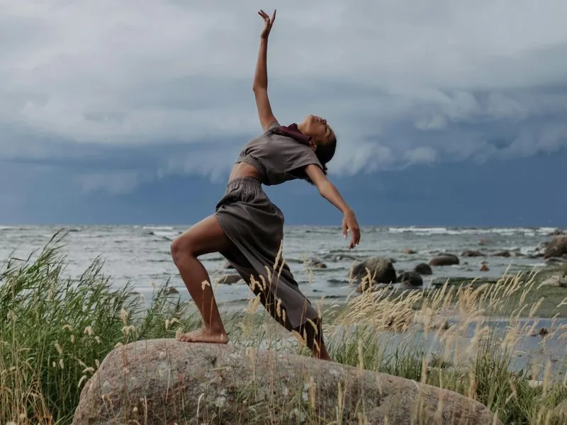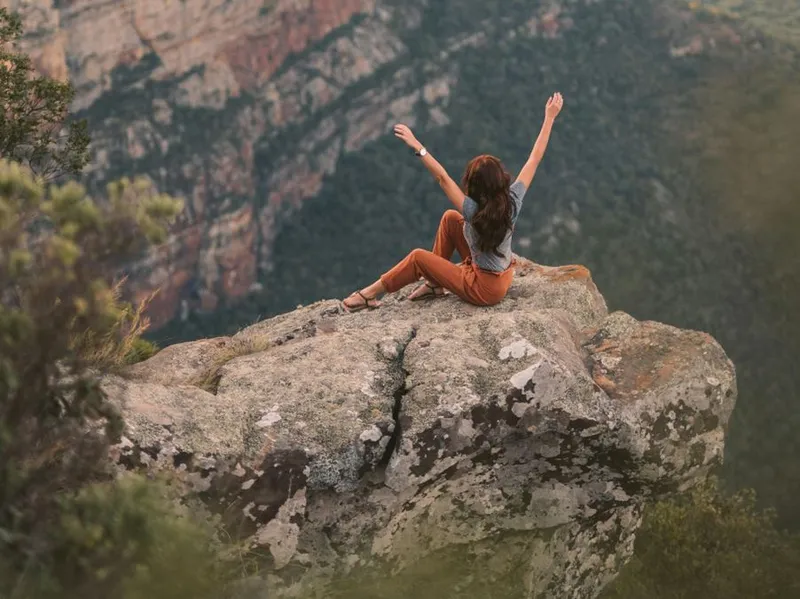 Femeie lipsită de griji, care ridică braţele, în timp ce priveşte peste vale - Foto: Pexels/Taryn Elliott