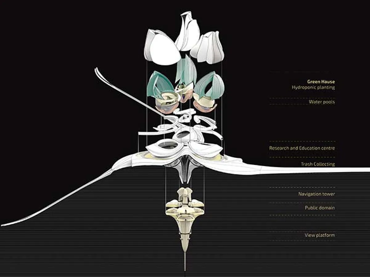 Urmează zona de sere hidroponice, în care sunt cultivate intensiv plante, centrul de cercetare a mediului marin și, bineînțeles, zona destinată locuințelor și altor facilități-suport.