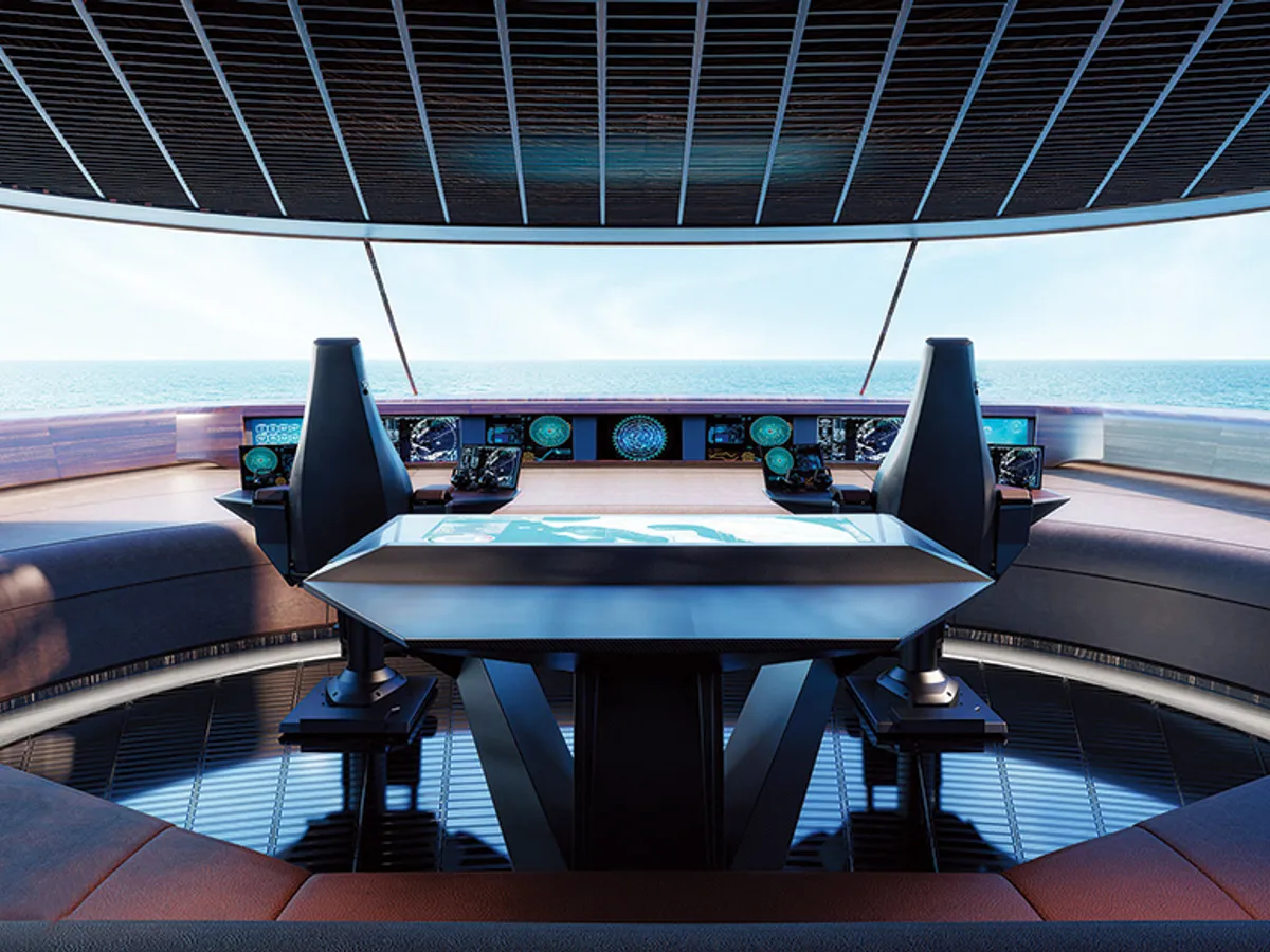 Elicopterul sau vehiculul tip dronă imaginat de proiectanți poate ateriza la „etajul 4“ (dacă luăm în calcul că prima punte este la nivelul mării, a doua este cea cu piscină iar a treia, cea cu camera de observație spectaculoasă), în spatele punții de comandă cu vedere la 360 de grade.