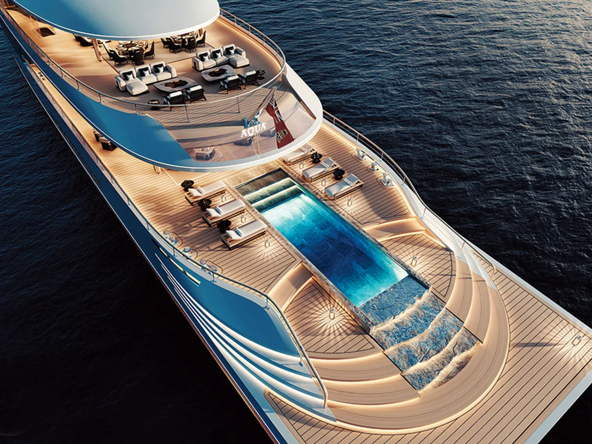 Proiectat de Sinot Yacht Design & Architecture și pus în operă de Feadship, o companie olandeză specializată în construcția de super-iahturi, Aqua este o navă de lux, cu un design futurist, inspirat, parcă, din filmele SF.