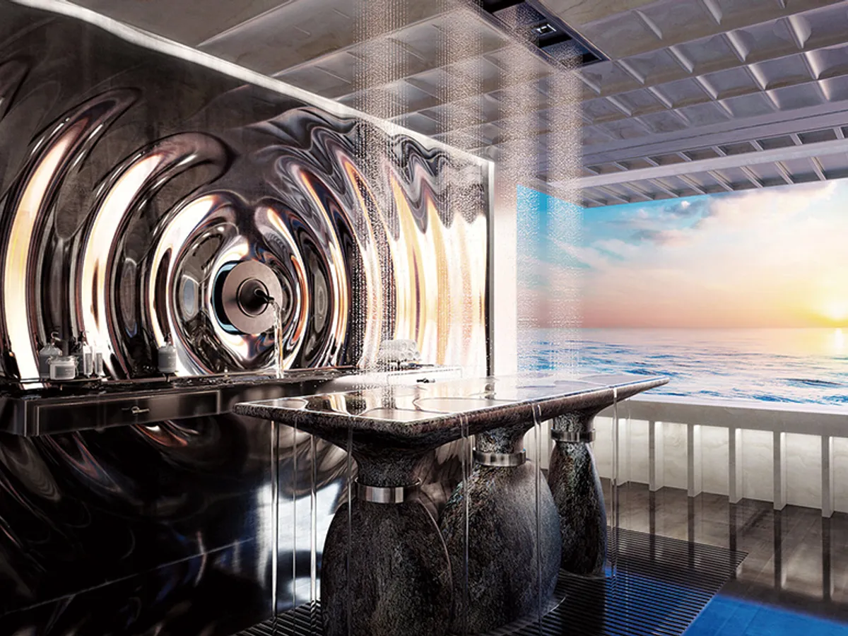 Prora aparent inversă se ridică până la nivelul punții superioare, unde se află o cameră cu vedere spectaculoasă. Apoi, liniile exterioare curbe ascund mai multe zone de relaxare și distracție.