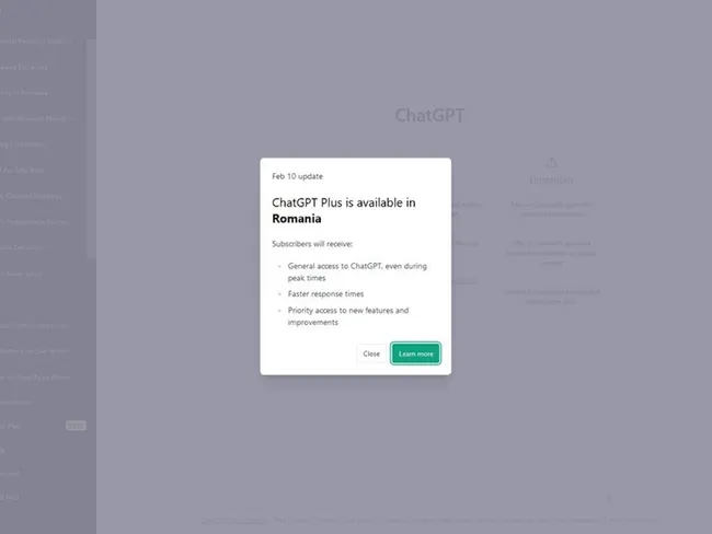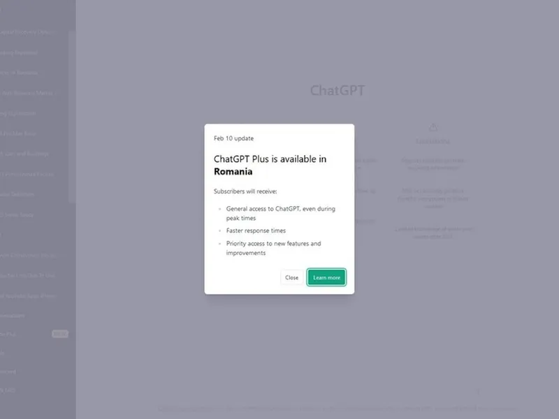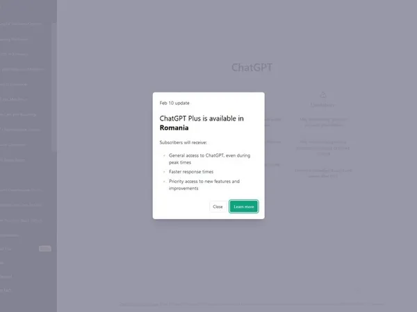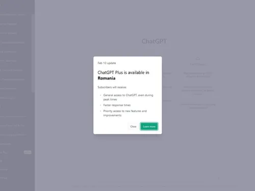 ChatGPT Plus este disponibil în România, conform unei notificări afişate utilizatorilor care accesează chatbot-ul celor de la OpenAI de pe teritoriul României, anunță agenția News.ro.
