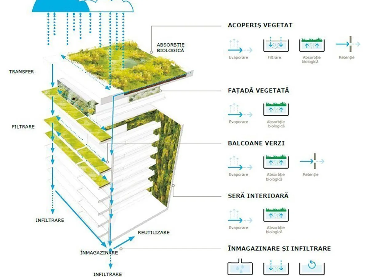 În interiorul clădirii, apa de ploaie poate fi depozitată, reciclată, filtrată și redată pânzei freatice.