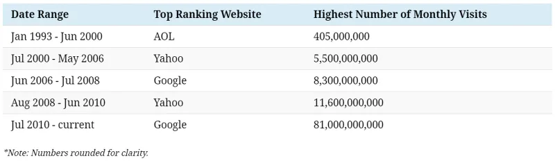 La începutul anului 1993, cel mai popular website era AOL, cu 20.885.024 de vizitatori în luna februarie, de exemplu. Iar totalul vizitelor de pe întreg Internetul ajungea la puțin peste 28,5 milioane. În vremea sa de glorie, spre sfârșitul anilor 1990, AOL a depășit 30 de milioane de utilizatori. Decăderea sa a început la începutul anilor 2000, odată cu trecerea de la dial-up la internet broadband, și a fost absorbit de Verizon.