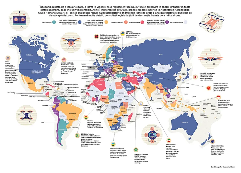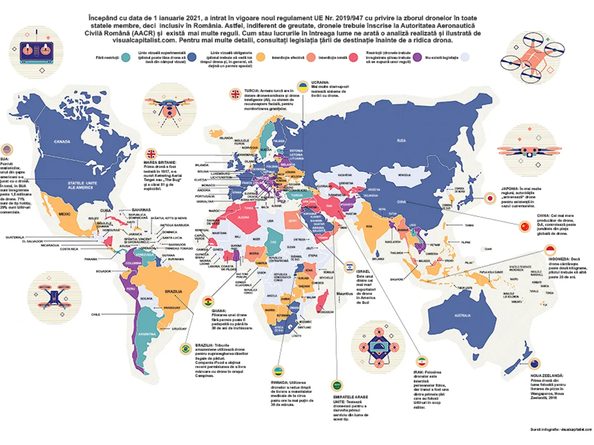 În timp ce în Europa se regăsesc printre cele mai liberale reglementări, în alte zone de pe glob utilizarea dronelor poate fi pedepsită cu până la 30 de închisoare.