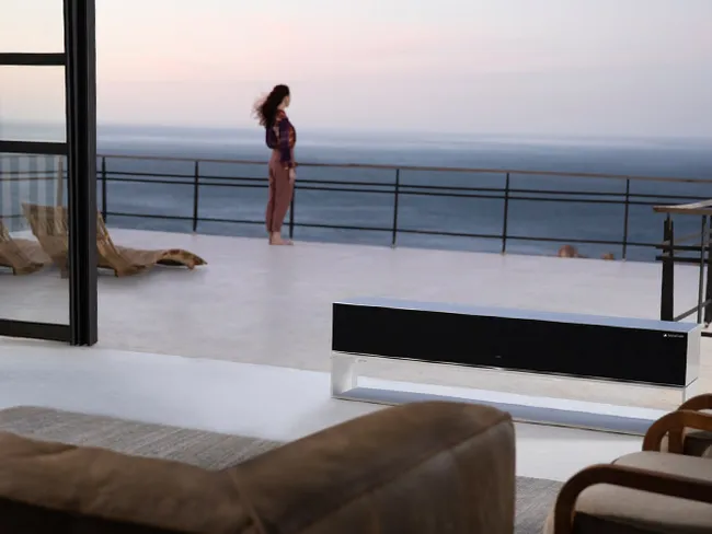 Cutia pe care stă și în care se ascunde ecranul funcţionează şi ca soundbar, Signature OLED R având sistem de sunet Dolby Atmos.