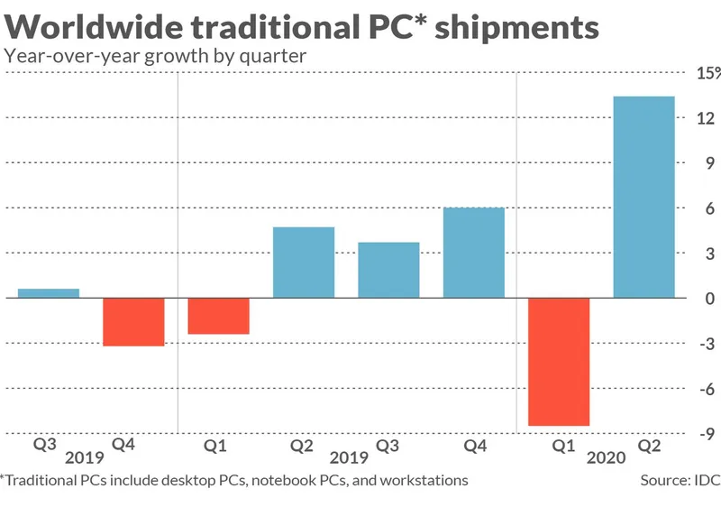În martie, imediat după izbucnirea pandemiei, rafturile de PC-uri au rămas goale, producătorii înregistrând rupturi de stocuri din cauza închiderii fabricilor de componente din China. Dar problemele nu au durat mult, producătorii legând noi și noi lanțuri logistice. Așa că, la sfârșitul celui de-al doilea trimestru, livrările globale de PC-uri au urcat cu 11,2%.