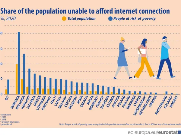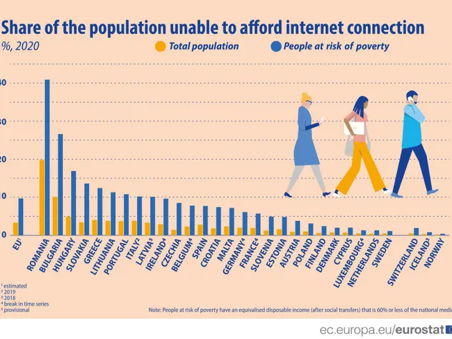 Aproximativ 3,3% din populaţia Uniunii Europene nu îşi permitea în 2020 o conexiune la Internet, în rândul statelor membre România fiind ţara cea mai afectată de această problemă, în condiţiile în care aproape o cincime din întreaga populaţie (19,8%) nu îşi permitea o conexiune la Internet, arată datele publicate de Eurostat.