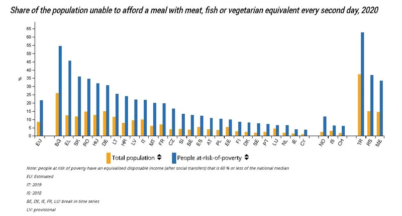 În populaţia totală, 25,9% din populaţia Bulgariei şi 14,7% din populaţia României nu îşi permite o masă care să conţină carne, peşte sau echivalentul vegetarian odată la două zile. Cea mai mare pondere a persoanelor în risc de sărăcie care nu îşi permit o masă care să conţină carne, peşte sau echivalentul vegetarian se înregistrează în Bulgaria (54,6%), Grecia (45,6%), Slovacia (36%) şi România (34,7%).