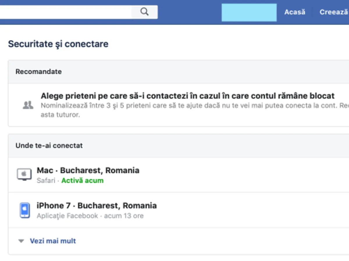 Din aceeași zonă de meniu de pe Facebook, “Securitate și conectare”, putem vedea toate dispozitivele din care suntem logați în contul nostru, la “Unde te-ai conectat”.