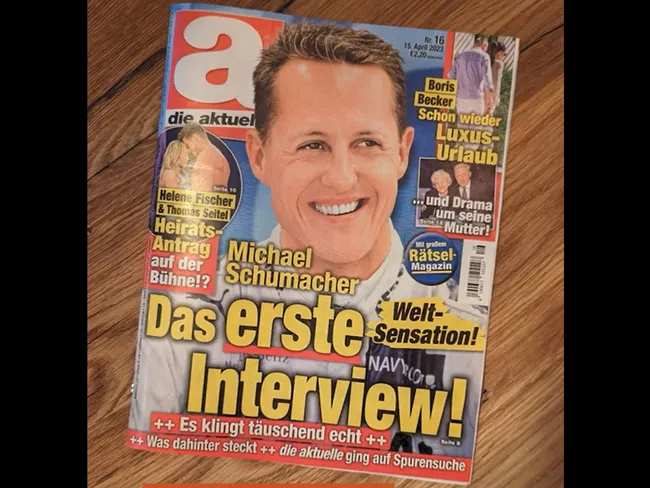 În goana după audiență, revista germană Die Aktuelle a publicat un așa zis prim interviu cu Michael Schumacher după accidentul la schi din 2013 în urma căruia a paralizat. „Exclusivitatea” a fost o minciună, articolul fiind generat cu ajutorul inteligenței artificiale (AI).