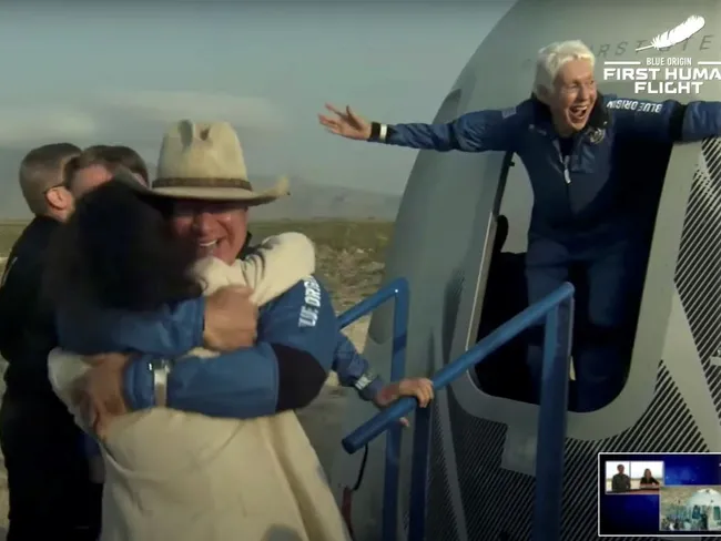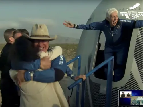 Bezos, în vârstă de 57 de ani, a fost însoţit de fratele său, Mark, cu şase ani mai mic, de cea mai vârstnică persoană care călătoreşte în spaţiu, Wally Funk, în vârstă de 82 de ani, fostă femeie pilot, dar şi de cel care a devenit astfel cel mai tânăr astronaut din istorie, Oliver Daemen, de 18 ani, care a primit în dar această călătorie.
