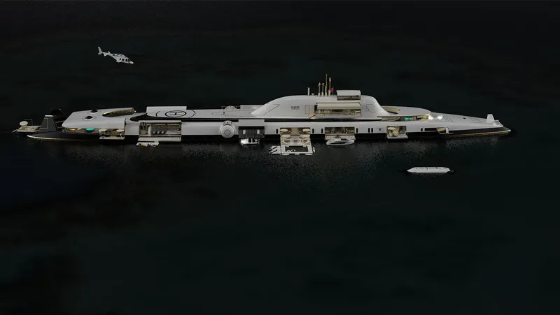 Datorită dimensiunilor sale, superyacht-ul submarin este pregătit să transporte chiar și un elicopter și tot ce își dorește proprietarul, inclusiv drone, baloane cu aer cald, vehicule 4x4 sau SUV, totul depozitat în siguranță în interior, pentru a naviga atât la suprafață, cât și sub apă.
