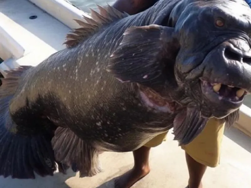 O fotografie cu un bărbat care ține un peștele uriaș cu o față asemănătoare a unei gorile, pescuit în Trinidad, Caraibe, a devenit virală pe toate site-urile de socializare importante.