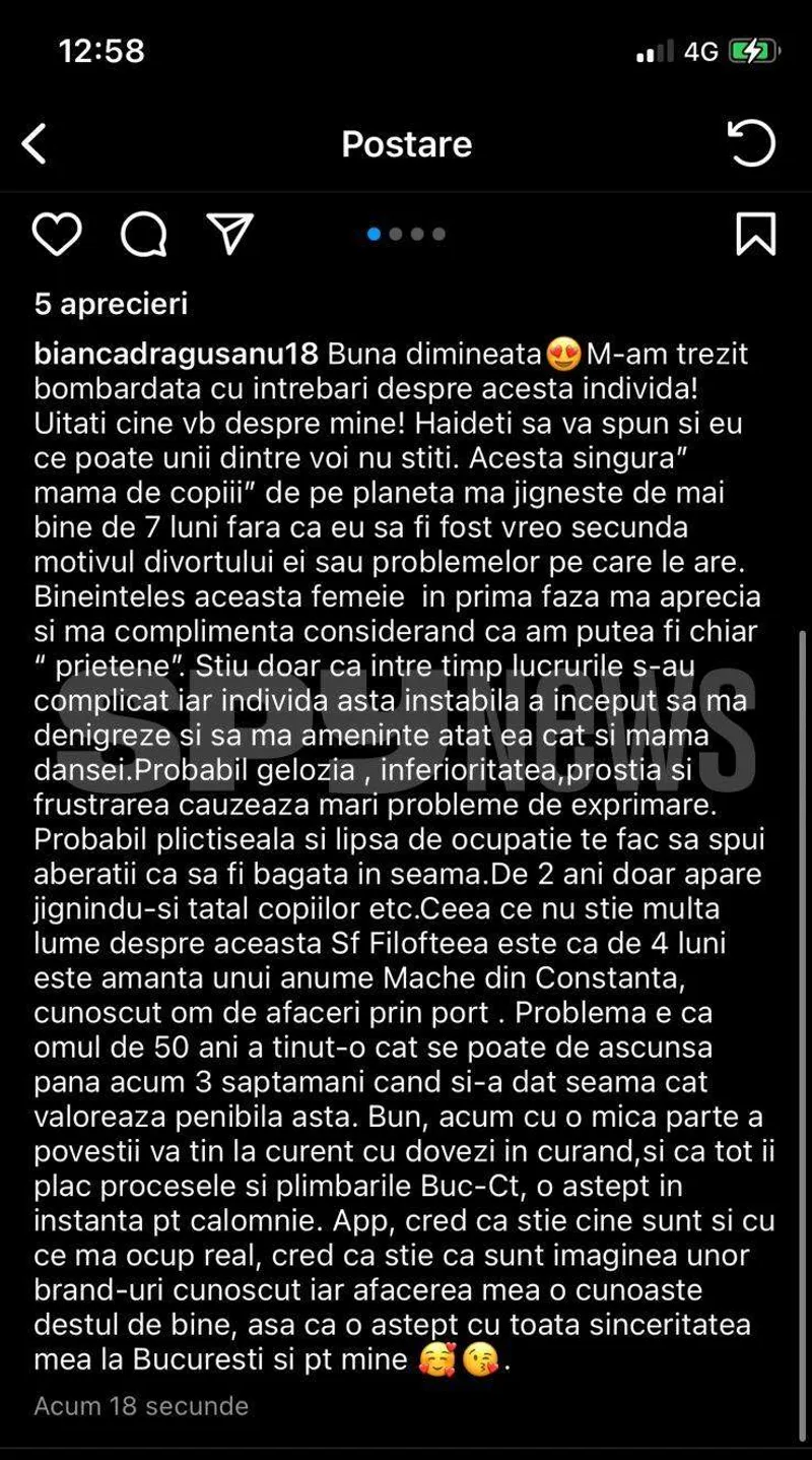 ”Buna dimineața😍M-am trezit bombardată cu întrebari despre acesta individa! Uitați cine vorbește despre mine! Haideți să vă spun și eu ce poate unii dintre voi nu știti. Acesta singură” mamă de copiii” de pe planetă ma jignește de mai bine de 7 luni fară ca eu să fi fost vreo secunda motivul divorțului ei sau problemelor pe care le are. Bineînteles această femeie în primă fază ma aprecia și mă complimenta considerând că am putea fi chiar “ prietene”. Știu doar ca între timp lucrurile s-au complicat iar individa asta instabilă a început să ma denigreze și să mă amenințe atât ea cât și mama dansei.”, a scris Bianca Drăgușanu pe Instagram.