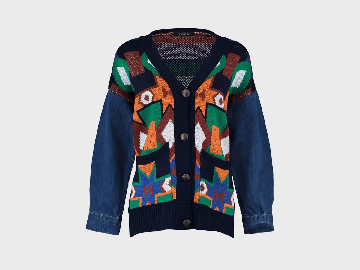 Cardigan pentru petreceri: de ce nu? Geometric și în culori deschise, parcă desenate de un pictor al secolului al XX-lea, vă veți binedispune înainte să înceapă muzica.
