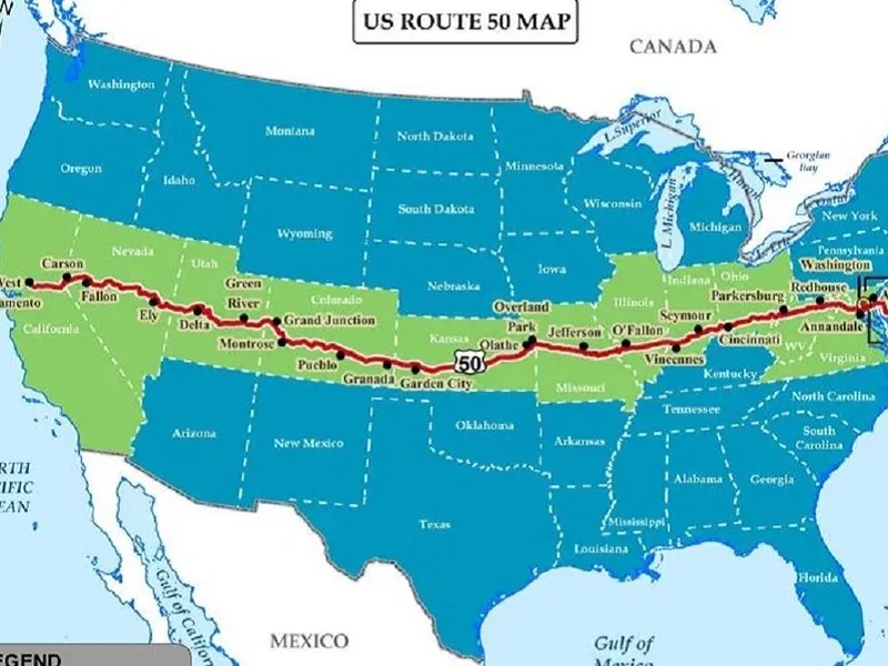 Harta Route 50, drumul care „taie” Statele Unite de la est la vest - Foto: mapsofworld.com