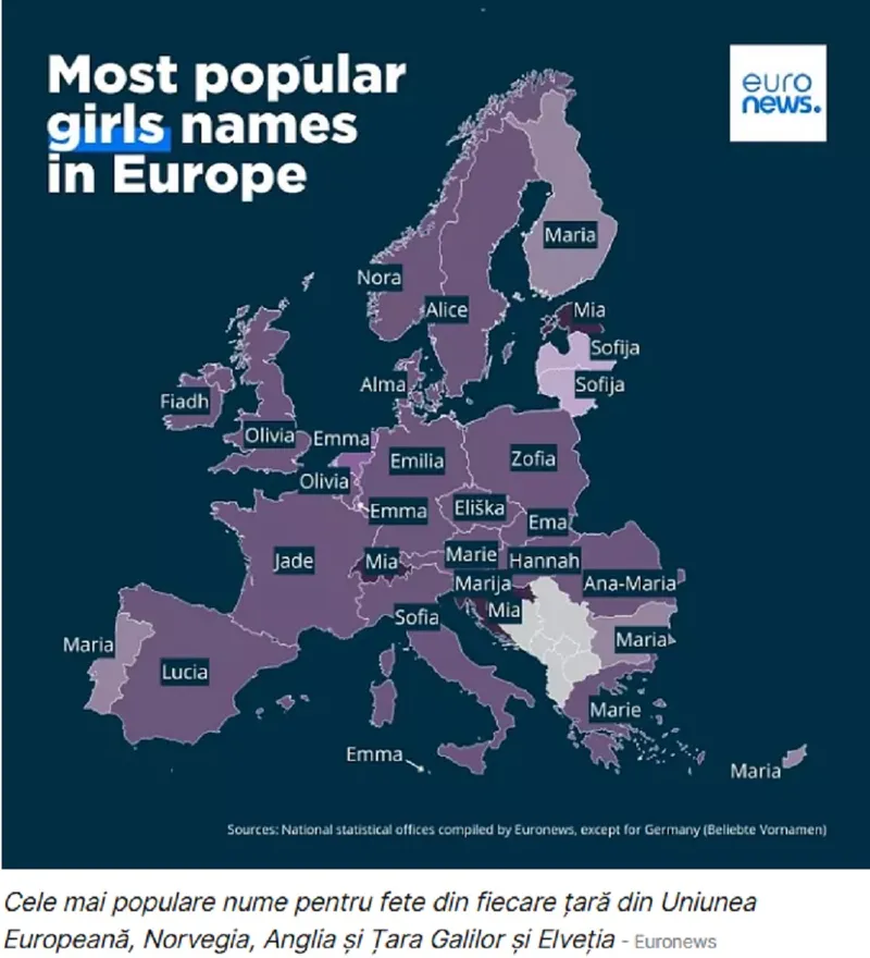 Însă cele mai comune nume de fete în UE sunt următoarele, conform unui raport al specialiștilor.