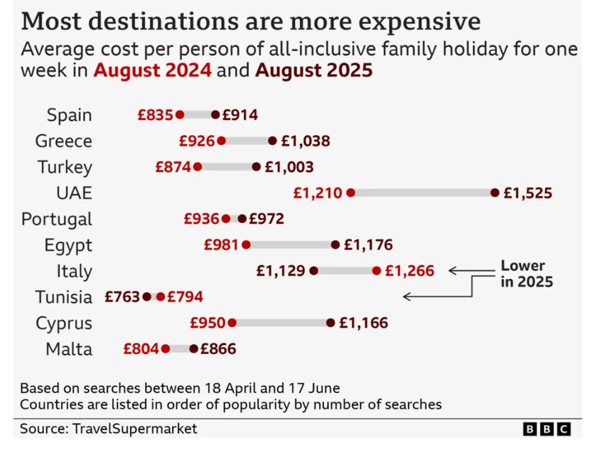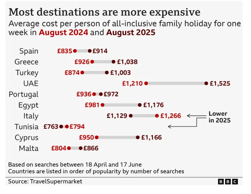 Prețurile pachetelor de vacanțe all-inclusive pentru familii au crescut pentru unele dintre cele mai populare destinații, inclusiv Spania, Cipru și Turcia.