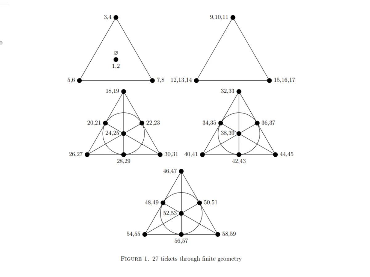 Ei descriu soluția folosind un sistem matematic numit geometrie finită, care se concentrează în jurul unei structuri triunghiulare numită plan Fano. Fiecare punct al structurii este marcat cu perechi de numere și conectat cu linii - fiecare linie generează un set de șase numere, care echivalează cu un bilet.