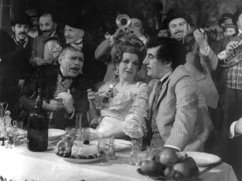 Rodica Tapalagă, în rolul Zoe Trahanache, alături de Toma Caragiu (Tipătescu) și Liviu Ciulei (Dandanache), în neuitata montare din 1972 a piesei „O scrisoare pierdută”, de la Teatrul Bulandra - Foto: bulandra.ro