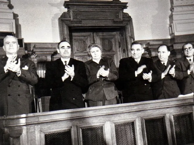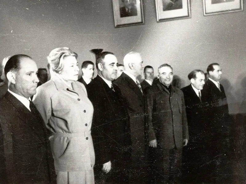 Teohari Georgescu, primul din stânga, în noiembrie 1951, alături de ceilalți lideri comuniști, Ana Pauker, Gheorghe Gheorghiu-Dej, Petru Groza, Vasile Luca, Alexandru Moghioroș și Iosif Chișinevschi - Foto Fototeca online a comunismului românesc - cota 183/1951