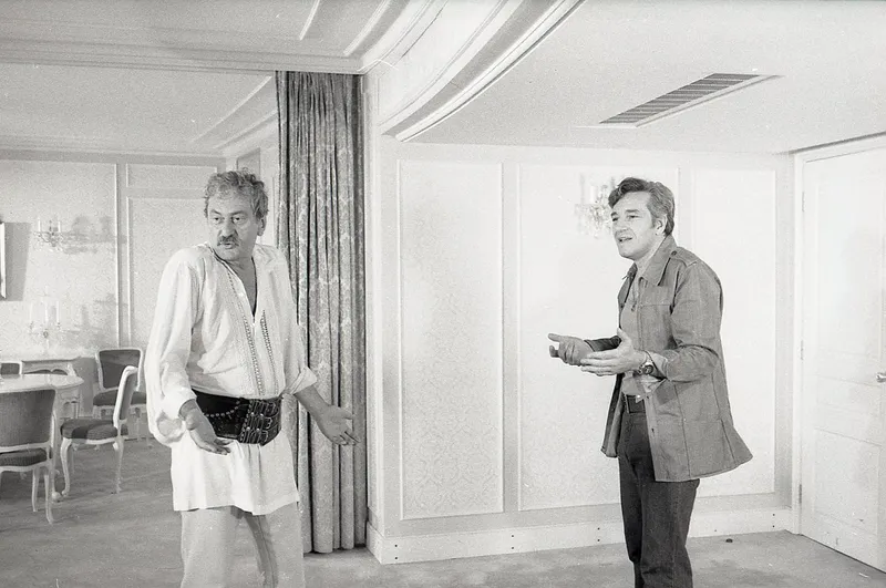 Sergiu Nicolaescu și Amza Pellea, în timpul filmărilor la marele succes de public „Nea Mărin miliardar” - Foto: Facebook/Studiourile Buftea