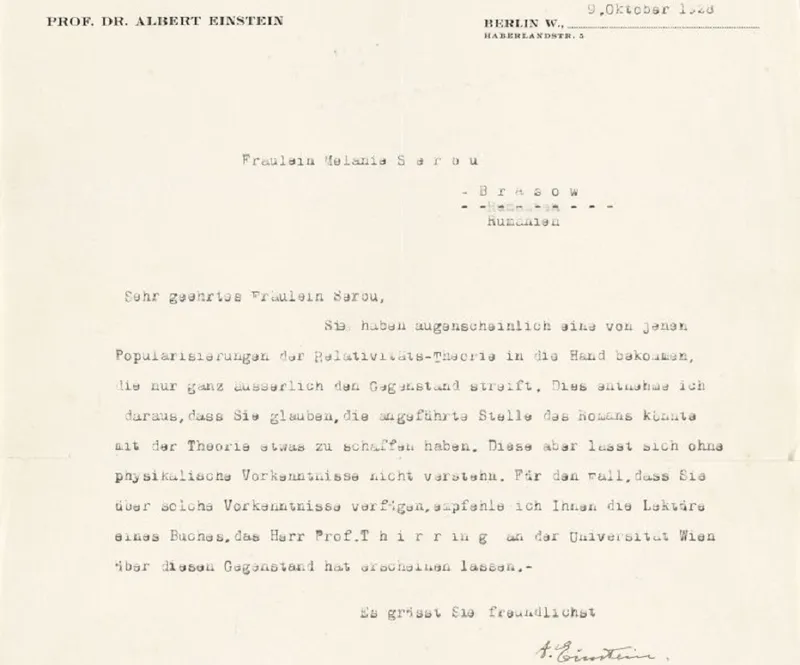 Sinceră să fiu: habar n-aveam despre teorie până atunci și nici că Einstein era un om de știință de renume mondial. Am adresat scrisoarea: profesorul Einstein, Berlin. Și am primit un răspuns, așa a început…