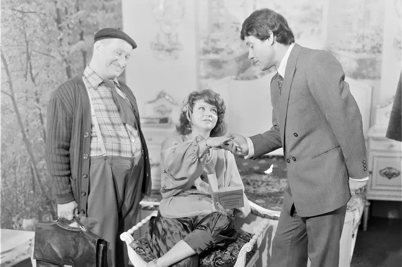Ștefan Mihaălescu-Brăila, în „Secretul lui Bachus”, alături de Carmen Zecheru, în rolul fiicei sale și de Emil Hossu, ziaristul care pentru a descoperi schema înșelăciunii cu vin acceptă să-i devină chiar și ginere - Foto: Studiourile Buftea