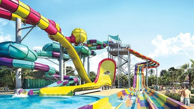Parcul acvatic dispune de 13 slide-uri și o piscină cu valuri