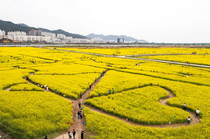 În decorul pașnic al Râului Nakdong, parcul se îmbracă într-un veșmânt de flori de rapita, creând peisaje spectaculoase. Aventura continuă pe Insula Jeju, unde câmpurile de rapiță își etalează splendoarea aurie de la începutul lunii martie până în aprilie, oferind un spectacol natural inedit.