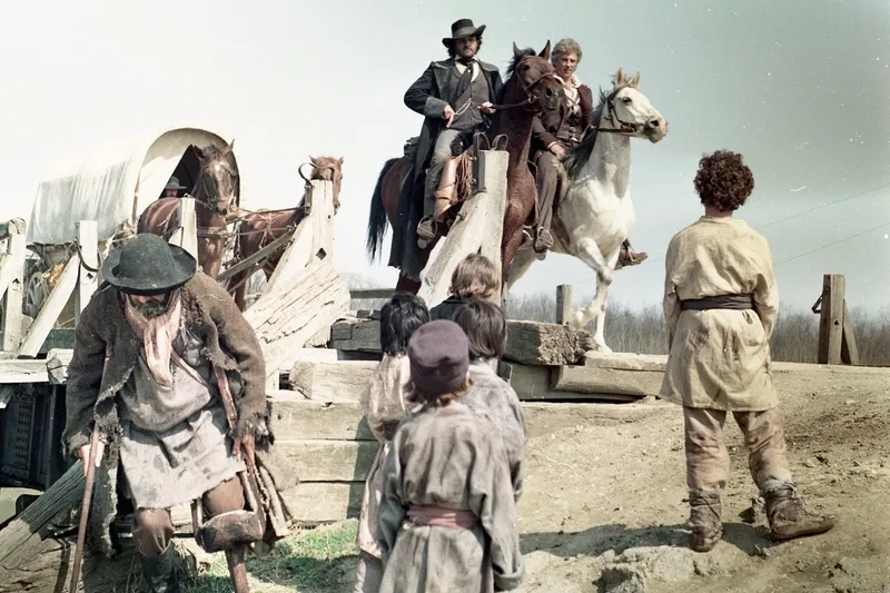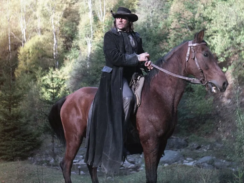 Florin Piersic și Szoby Cseh, pe cai, adică Mărgelatu și Buză de Iepure - Foto: Facebook/Studiourile Buftea