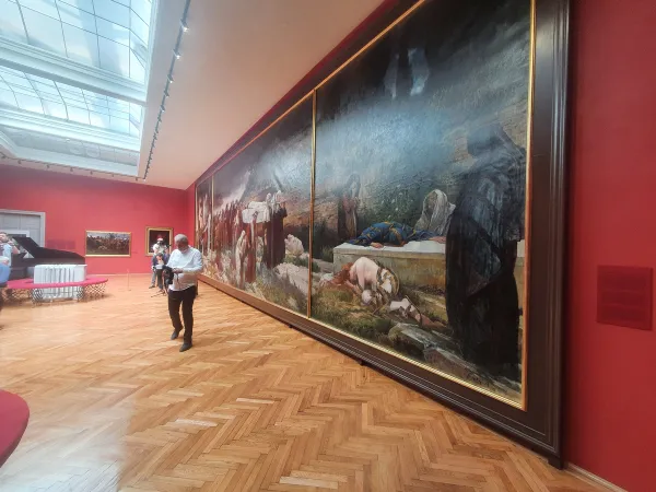 Cea mai mare pictură deţinută de Complexul Muzeal Arad, de 52 de metri pătraţi, realizată în secolul al XIX-lea, a fost ascunsă timp de decenii de către comunişti, deşi în lumea artei este considerată o comoară, care a fost expusă în mari oraşe europene şi a ajuns în proprietatea statului român în urma Tratatului de Pace de la Trianon.