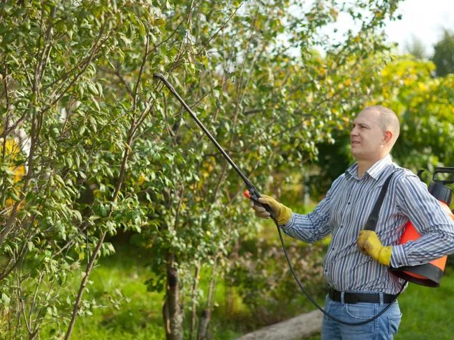 Aplică tratamentele doar când vântul este slab și direcționează pulverizatorul către pomi, nu către pajiște sau alte spații deschise.