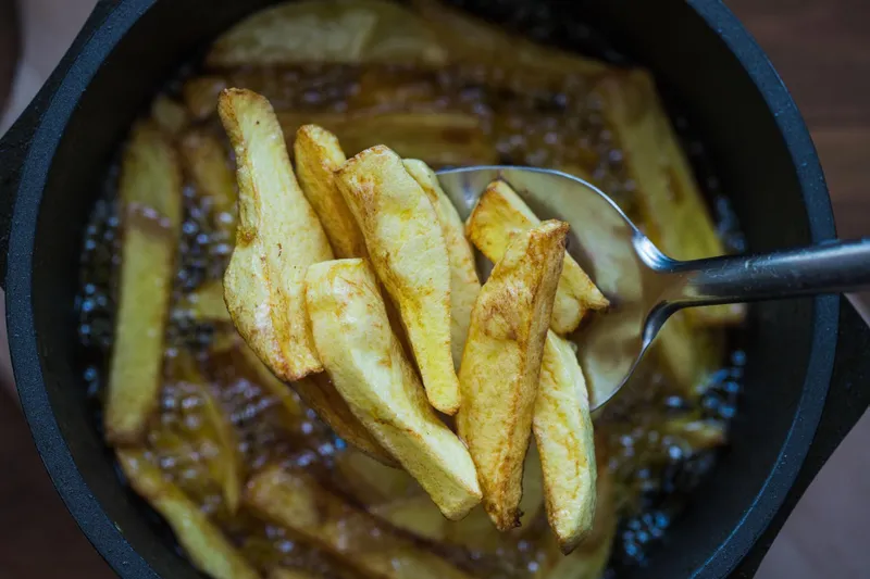 Prăjirea propriu-zisă trebuie făcută în ulei bine încins, ideal într-o tigaie largă, unde cartofii au suficient spațiu pentru a nu se lipi între ei. Este important ca uleiul să fie unul cu punct de ardere ridicat, precum cel de floarea-soarelui sau de arahide.