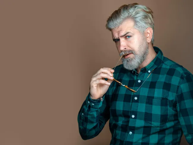 Mustața și barba ușor cărunte pot adăuga maturitate, însă dacă nu sunt îngrijite, pot crea un contrast care accentuează ridurile.