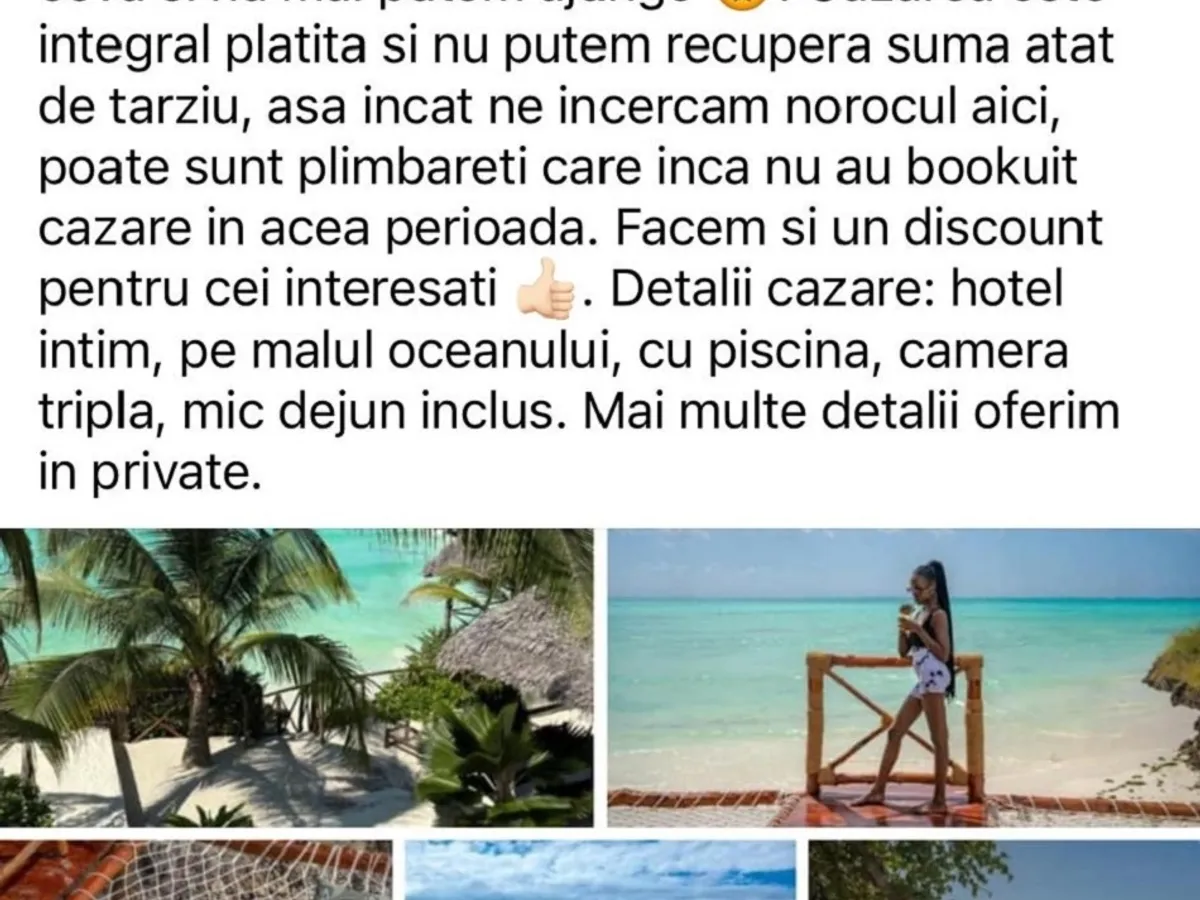 ”Este cineva interesat de bilete de avion București - Dubai - Zanzibar pentru 2 adulți și un copil cu plecare in data de 09.02.2024 și întoarcere pe 18.02.2024? Și cazare la Tui blue bahari Zanzibar cu all inclusive! A intervenit ceva și nu mai putem pleca!”, este anunțul postat de un turist pe grupul Forum Zanzibar de pe Facebook.
