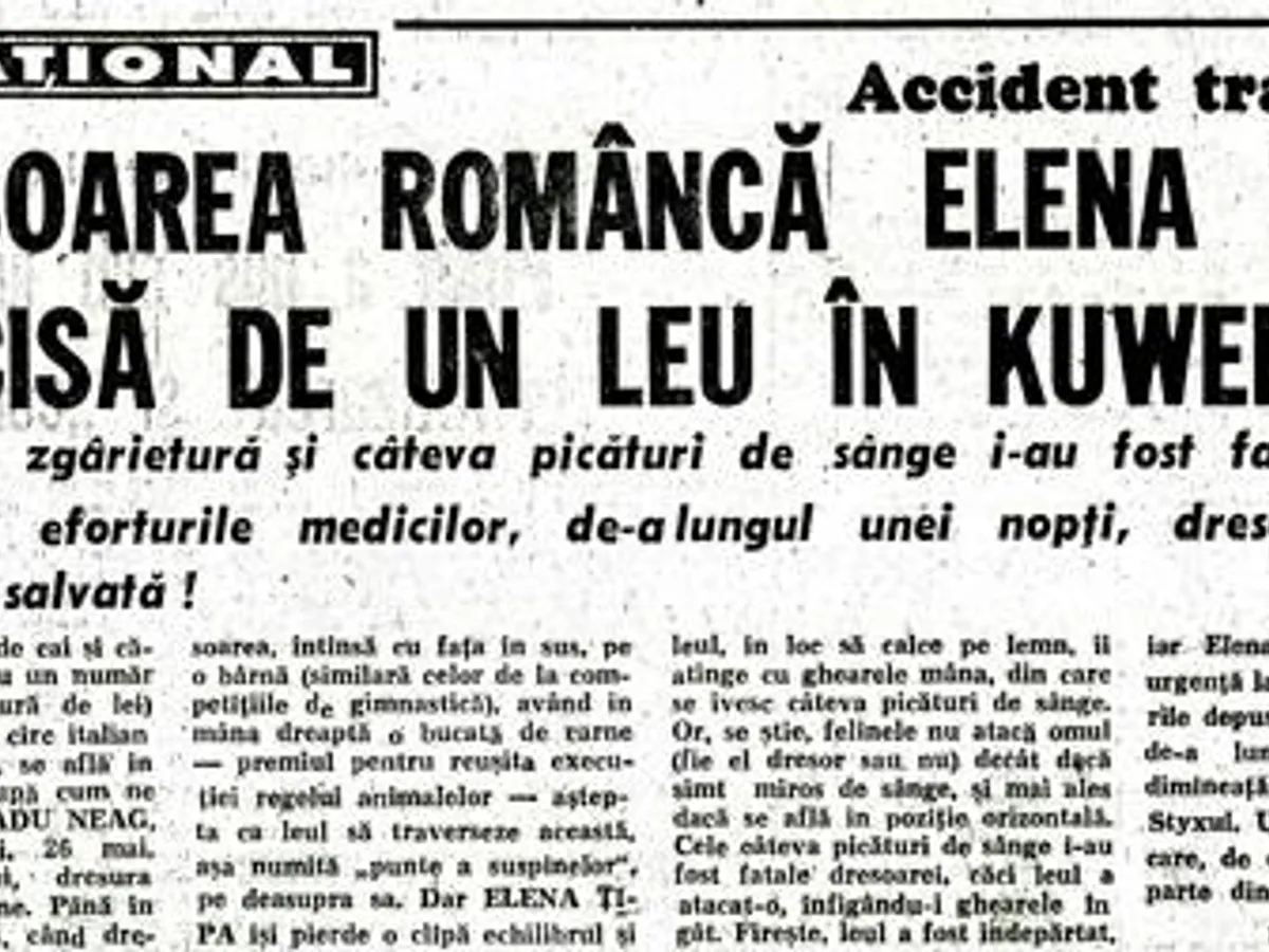 Elena Tipa a cazut in arena, iar sangele tasnea din gatul ei ca dintr-o fantana arteziana. Se scurgea viata din ea, si nimeni nu putea face nimic. Leul Albert, preferatul, care fara voie a devenit si ucigasul ei, statea langa dresoarea moarta si nu intelegea nimic. Leul Albert a fost impuscat, scrie artacircului.ro.