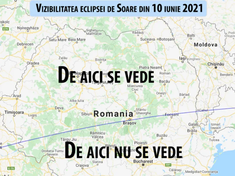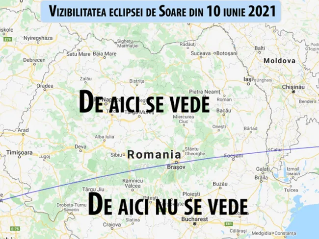 „Pe 10 iunie se produce o eclipsă de Soare care se va vedea ca parţială din jumătatea de nord a ţării noastre. Eclipsa începe cel mai devreme la ora 13:17, în nord-vest, şi va avea ca acoperire maximă 2,1% din discul Soarelui.
