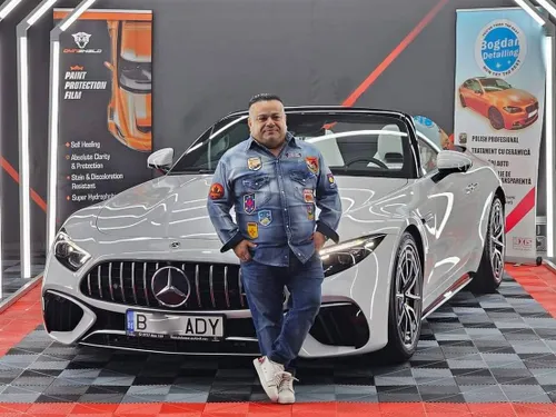 Nu se observă clar dacă este vorba despre un SL 55 AMG sau un SL 63 AMG. Dar, interesant, fotografia este făcută într-un atelier specializat în detailing, în curățarea, tratarea și protejarea caroseriei și a interiorului, ceea ce denotă faptul că manelistul are mare grijă de bolidul său.