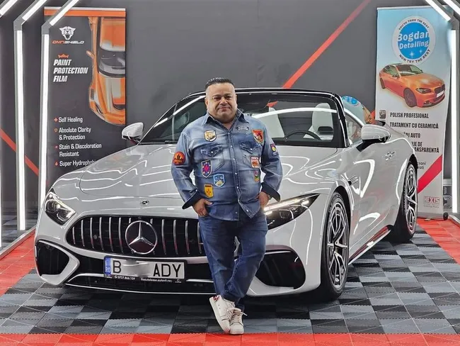 Într-o imagine postată recent pe rețelele de socializare, manelistul Adi Minune apare în compania unui Mercedes SL de ultimă generație, cu „ADY” la număr, un coupe decapotabil care costă circa 200.000 €.