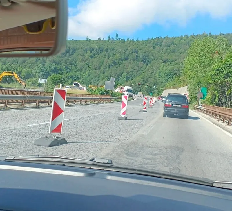 Primul „obstacol” se află pe autostrada Pleven – Sofia, unde, din cauza lucrărilor de reabilitare, se circulă în coloană, cu viteză redusă, pe un singur fir, pe banda de urgență.
