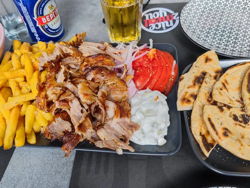 Gyros de porc la farfurie 8 euro, salată grecească 6 euro, un suc 2 euro, o apă 0.5 euro, 3 pita, o bere 2 euro și un sos 0.6 euro.