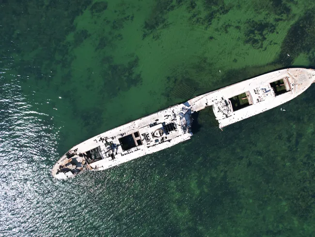 Zilele trecute, partea din față, de la pupa, s-a prăbușit în apă, iar bucăți mari din navă sunt în pericol să se scufunde oricând.