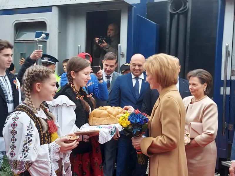 Membrii Familiei regale au fost întâmpinaţi cu pâine şi sare, la fel cum s-a întâmplat şi în gările Aiud şi Teiuş, unde trenul a staţionat vineri timp de 10 minute.