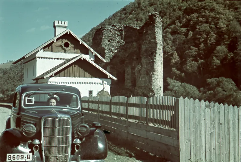 FOTO: Portret într-un Ford V8 1935 sedan lângă Turnul Spart de la Boița/ Boitza/ Bojca, prelucrare digitală după un pozitiv color pe nitrat de celuloză Agfacolor, format 35 mm, autor neidentificat, cca. 1942 - 1943, colecția AdF.