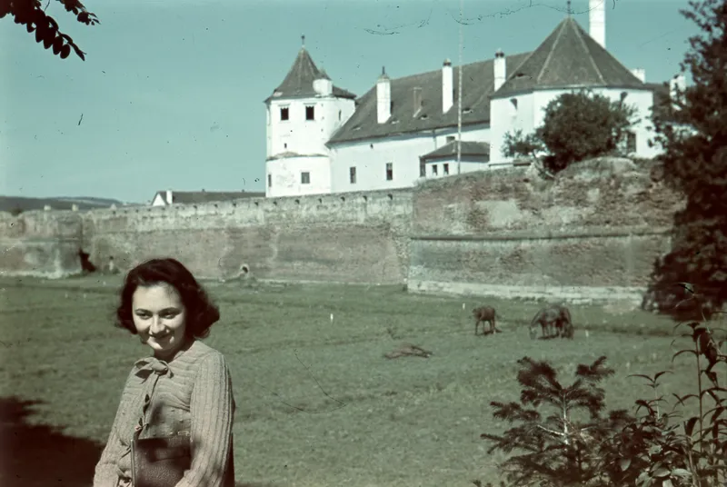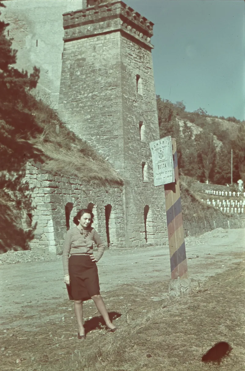FOTO: Portret la Castelul Făgăraș/ Fogarasch/ Fogaras, prelucrare digitală după un pozitiv color pe nitrat de celuloză Agfacolor, format 35 mm, autor neidentificat, cca. 1942 - 1943, colecția AdF.