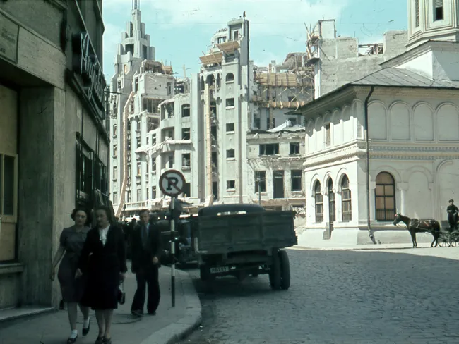 FOTO: București - Strada Academiei cu Biserica „Sf. Nicolae Dintr-o zi“ și Hotel Union bombardat, prelucrare digitală după un pozitiv color pe nitrat de celuloză Agfacolor, format 35 mm, autor neidentificat, 1946, colecția AdF.