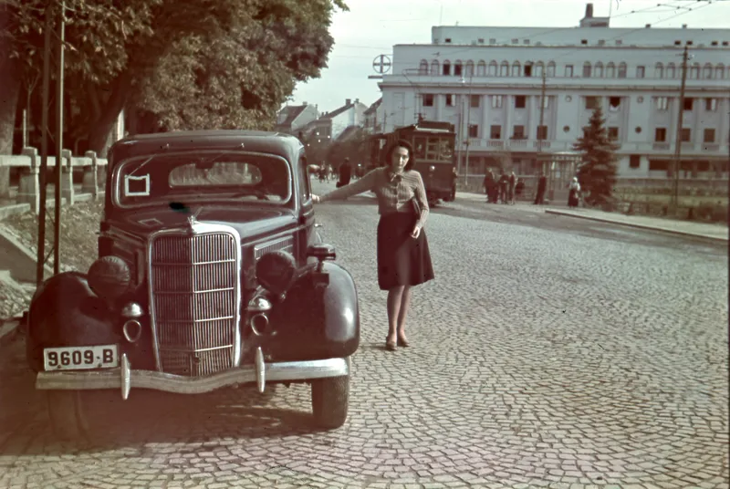 FOTO: Sibiu/ Hermannstadt/ Nagyszeben - portret cu un Ford V8 1935 pe strada Cisnădiei (actual Nicolae Bălcescu), prelucrare digitală după un pozitiv color pe nitrat de celuloză Agfacolor, format 35 mm, autor neidentificat, cca. 1942 - 1943, colecția AdF.